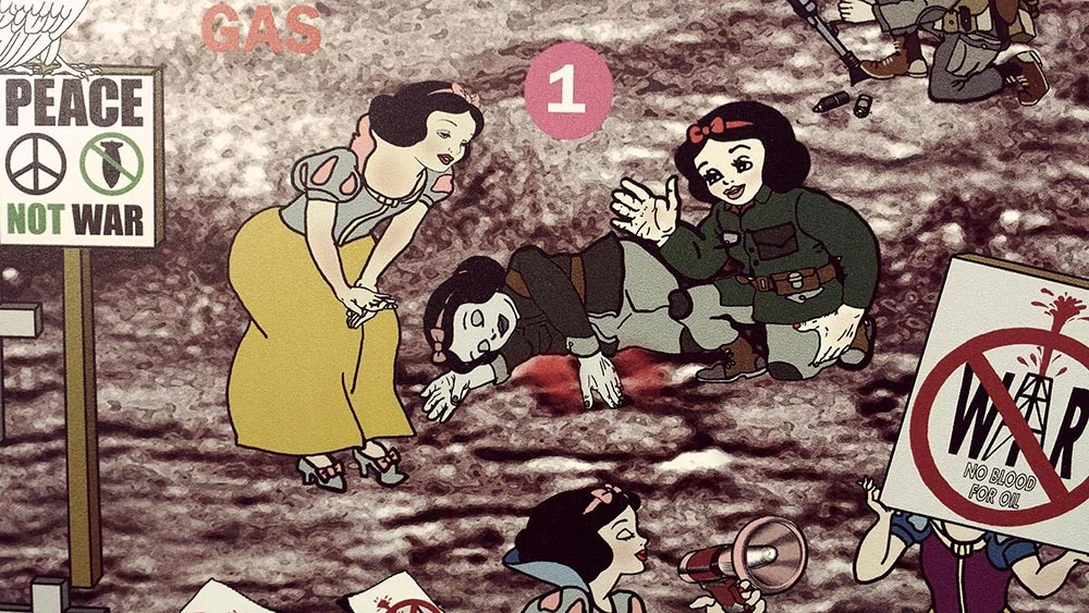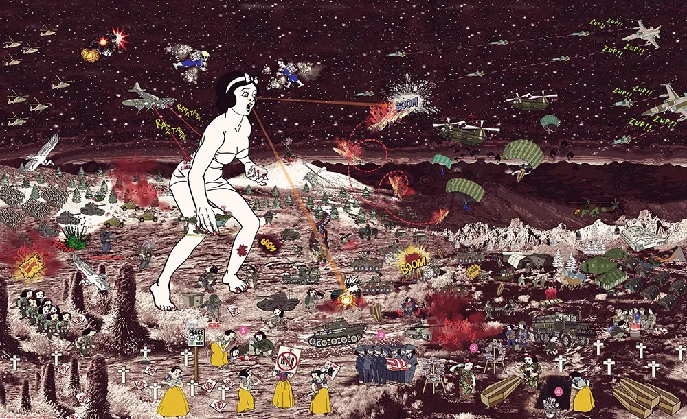 Empecé haciendo pequeños dibujos donde parodiaba el mundo Disney y los roles tan marcados de sus personajes, su encorsetamiento de lo bueno y lo malo, sus finales felices. Blancanieves representa un arquetipo de lo femenino pero en mis cuadros una veces peca de cándida y otras se deja llevar por la mala leche. La idea era ampliar su campo de acción y romper esa aureola de niña buena y paciente que la atenazaba. Romper con lo femenino hizo crecer el personaje. Ya no se le ponía nada por delante y hacía lo que le daba la gana. Puede destruir lo establecido o generar nuevas propuestas, bajar a los infiernos o elevarse hacia alturas más o menos místicas. Las hay buenas, malas, asesinas, zombies, negras, pacifistas, travestis, ninfómanas, enfermas, soldados, extraterrestres, policías, activistas… para mí Blancanieves es la masa madre, el Big Bang del que surge todo.