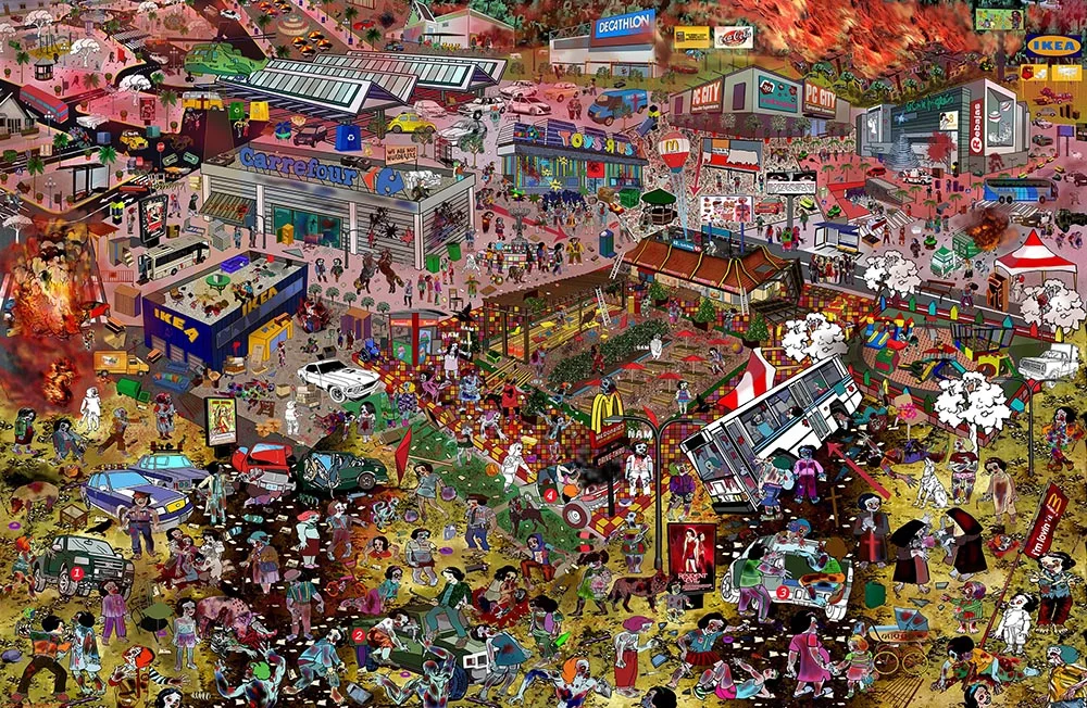 En general, en todas esas obras a las que haces referencia he pretendido ofrecer una visión caótica y apocalíptica a la vez cargada de humor e ironía sobre los tópicos de una sociedad de consumo cada vez más adormecida y adicta a la carne picada. Así, En Save the Arctic! hago hincapié en lo absurdo de algunas acciones humanas como puede ser la inclusión de un Resort y un parque de atracciones en pleno Ártico, la matanza indiscriminada de focas y ballenas, la basura, la lucha por el petróleo, máquinas generadoras de nieve contra el cambio climático, osos polares ahogándose…